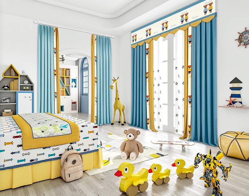 4、窗簾尺寸要根據(jù)兒童房間窗戶的大小來決定,一般上下左右都要多出一塊來才好,特別是下面的部分,既不要垂到地上,也不能太短,否則很不協(xié)調(diào)。如果自己拿不準,可以讓專業(yè)的窗簾商人來測量并安裝。