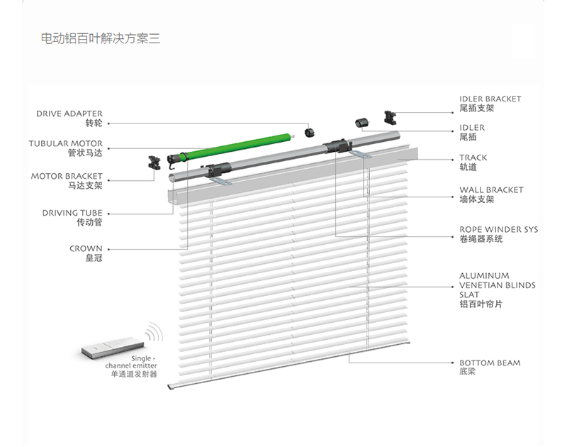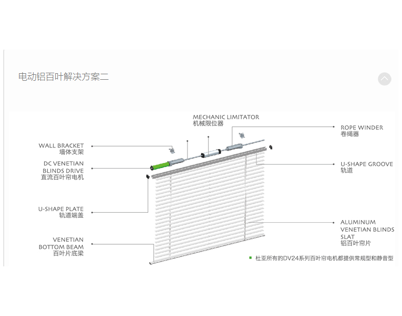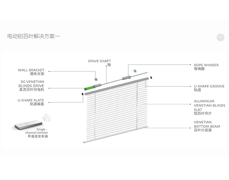 MotorizedAluminiumVenetianBlinds電動(dòng)鋁百葉室內(nèi)電動(dòng)鋁百葉使用鋁合金簾片,通過卷繩系統(tǒng)帶動(dòng)簾體的上下運(yùn)行及簾片翻轉(zhuǎn),起到光線調(diào)節(jié)與